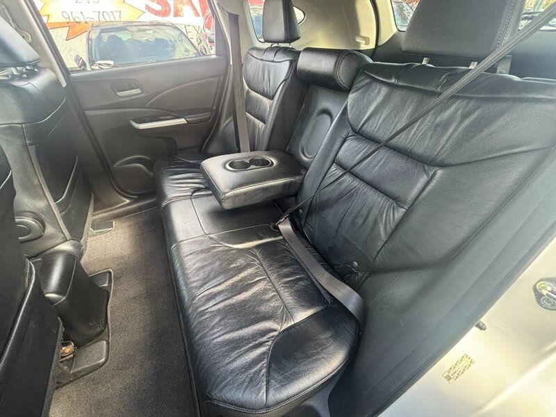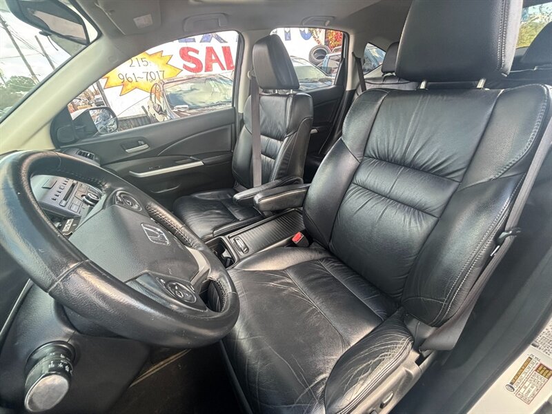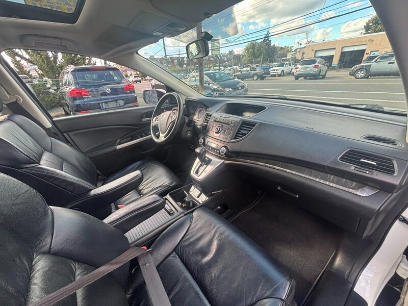 The 2014 Honda CR-V EX-L is a versatile and stylish SUV, featuring a White Diamond Pearl exterior complemented by a luxurious black leather interior. Powered by a 2.4L I4 engine delivering 185 horsepower and 163 ft-lbs of torque, this vehicle balances performance and efficiency, achieving an impressive 22 MPG in the city and 30 MPG on the highway. Factory standard features include a power moonroof, heated front seats, a rearview camera, and a premium audio system with Bluetooth connectivity. The spacious cabin offers ample cargo space and a comfortable ride, making it an ideal choice for families or those seeking practicality. This CR-V is in excellent overall condition, ready for its next adventure.
